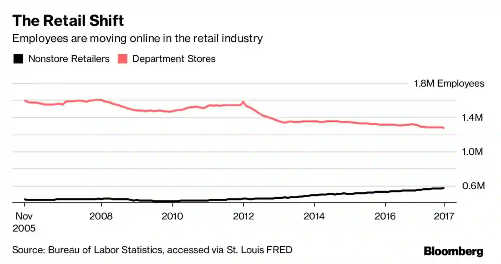 如今全球有超过10%的零售额来自网上零售,高于上世纪90年代中期的2.5%,这种变化对就业市场构成了影响。纽约联储的研究人员称,2013年以来,百货店行业已净减约8万个工作岗位,而包括网上零售在内的无店铺零售业则增加了约10万个工作岗位。