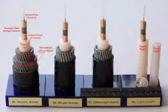 现在的海底光缆也分不同类型,其中最细的就像花园浇水的软管,最粗的直径可达3英寸(约合7.62厘米)。上图中最右边的光缆重量最轻,它主要用在深海中。海底光缆的核心是光纤,其外层则包裹着防水的凡士林和多层金属(铰接在一起)。