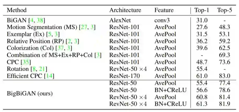 我们证明了BigBiGAN (BiGAN with BigGAN generator)与ImageNet上无监督表示学习的最先进技术相匹敌。