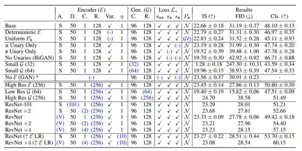 表1:多个BigBiGAN变体的性能结果,在生成图像的初始分数(IS)和Fréchet初始距离(FID),监督式逻辑回归分类器ImageNet top-1精度百分比(Cls。)由编码器特征训练,并基于从训练集中随机抽样的10K图像进行分割计算,我们将其称为“train-val”分割。