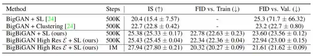 这些结果表明,BigBiGAN显著提升了以IS和FID为量度的基线无条件BigGAN生成结果的性能。