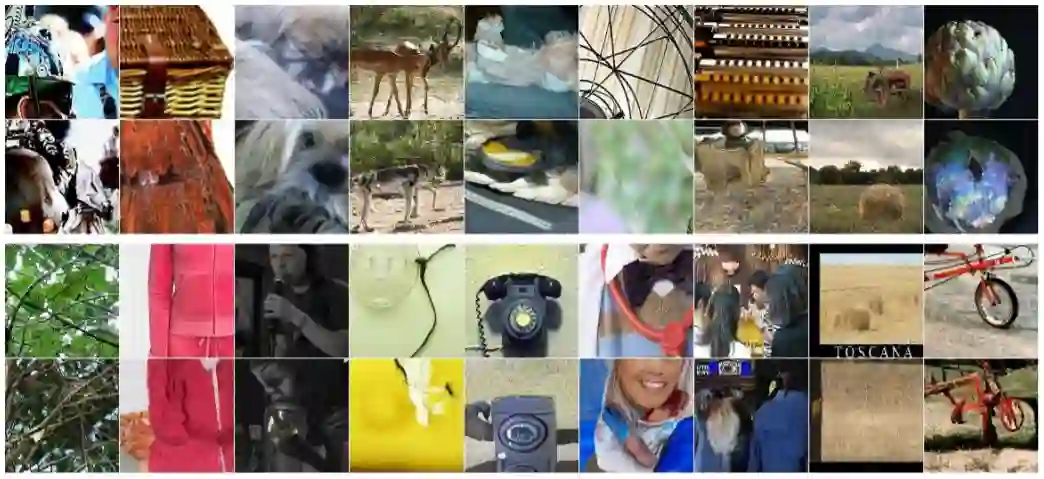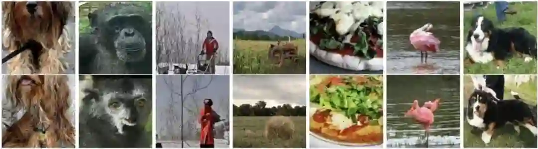 图2:从无监督的BigBiGAN模型中选择的图像重建结果。上面一行的图像是真实图像(x~Px),下面一行图像是由G(E(x))计算出的这些图像的重建结果。与大多数显式重建成本(例如像素数量)不同,由(Big)BiGAN 实现隐式最小化的重建成本更多倾向于强调图像的语义及其他更高级的细节。