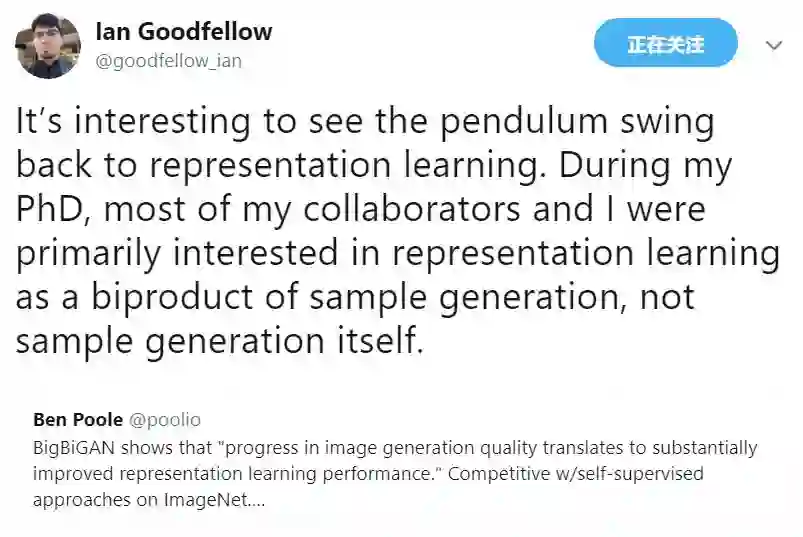 这篇论文在Twitter上引发很大反响。GAN发明人Ian Goodfellow说:“很有趣,又回到了表示学习。我读PhD期间,我和大多数合作者都对作为样本生成的副产品的表示学习很感兴趣,而不是样本生成本身。”
