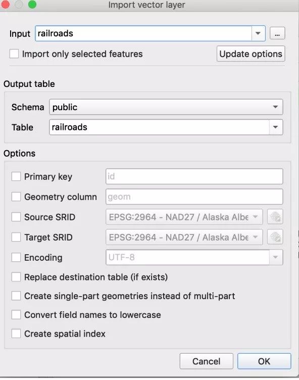 选择“Import Layer”菜单,在输入列表“Input”选择要入库的图层(上面刚添加的本地文件),然后在选择“Schema”,这里选择是“Public”,并自定义入库后的表名,如果需要创建空间索引需要勾选“Create Spatial Index”,然后点击“OK”按钮实现数据入库