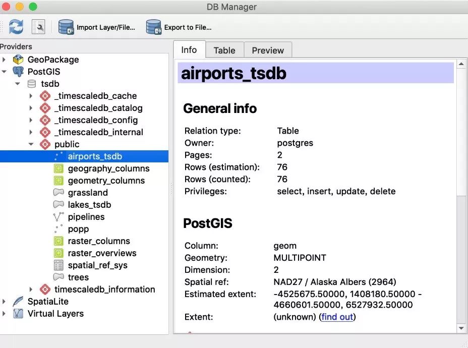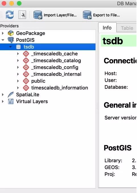 点击“PostGIS”目录,选择“tsdb”子目录。