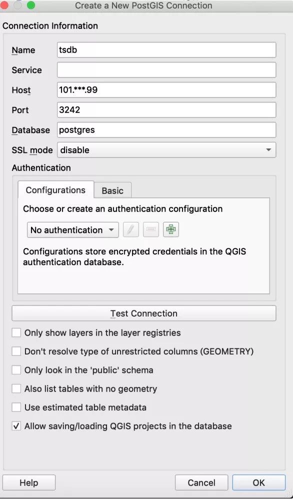 Host即为公网对应的IP,然后点击“Test Connection”,需要填写数据库用户名和密码,测试通过后,点击“OK”保存TSDB时空数据库连接。成功之后在左侧目录会看到