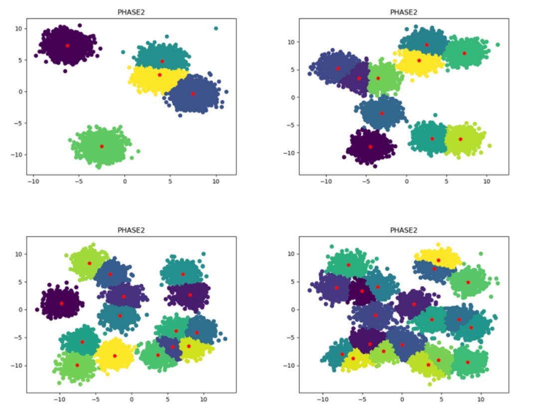使用本项目复现的代码对中心数量分别为5、10、15、20的数据集进行聚类的效果图如下(数据集大小为1万)