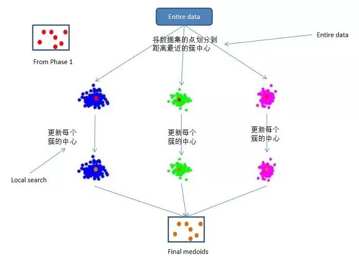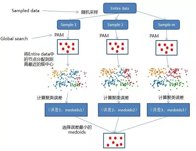 算法思想:对整个数据集进行随机采样(sampled data ),生成m个规模为n的子集。然后对m个子集并行执行PAM算法(global search),计算整个数据集的聚类误差,选择聚类误差最小的中心集合