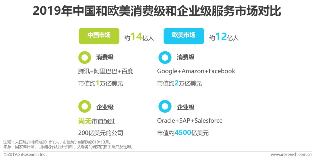 美国CRM SaaS公司Salesforce一直以来被作为全球SaaS行业的标杆。2018年,Salesforce市值首次突破千亿大关,从市值500亿美元到1000亿美元,它仅用了不到三年时间。具有打造“中国版Salesforce“野心的中国SaaS厂商不在少数,但至今尚未出现任何一家能够望其项背。事实上,不仅仅是在SaaS行业,即使是放大到整个企业服务市场,中国厂商的市值都远远落后于欧美市场,和消费级服务相比有极大的成长空间