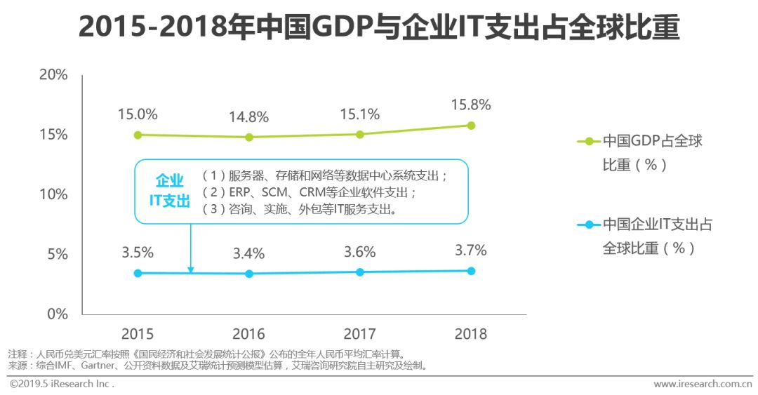 中国企业信息化水平与经济总量的关系极不平衡;SaaS作为突破口拉近中国与领先国家之间的差距:2018年中国GDP占全球的比例达到15.8%,IT支出占比仅为3.7%,企业信息化发展水平滞后;企业级SaaS市场规模为243.5亿元,中国市场起步较晚,预计将在全球市场增长趋缓后继续保持高增长率。