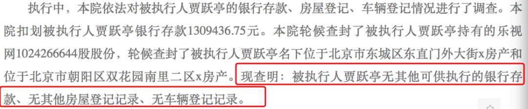 同时,该法院查明,贾跃亭无其他可供执行的银行存款、无其他房屋登记记录、无车辆登记记录。