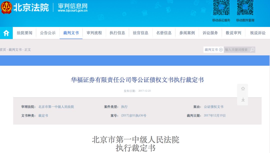 除了北京证监局责令贾跃亭回国之外,12月25日。北京法院审判信息网挂出的裁定书,法院在对贾跃亭与华福证券公证债权纠纷一案的强制执行过程中,扣划了被执行人贾跃亭银行存款130.94万元,并轮候查封了贾跃亭持有的乐视网10.24亿股股份以及其名下位于北京市东城区东直门外大街x房产,和位于北京市朝阳区双花园南里二区x房产。