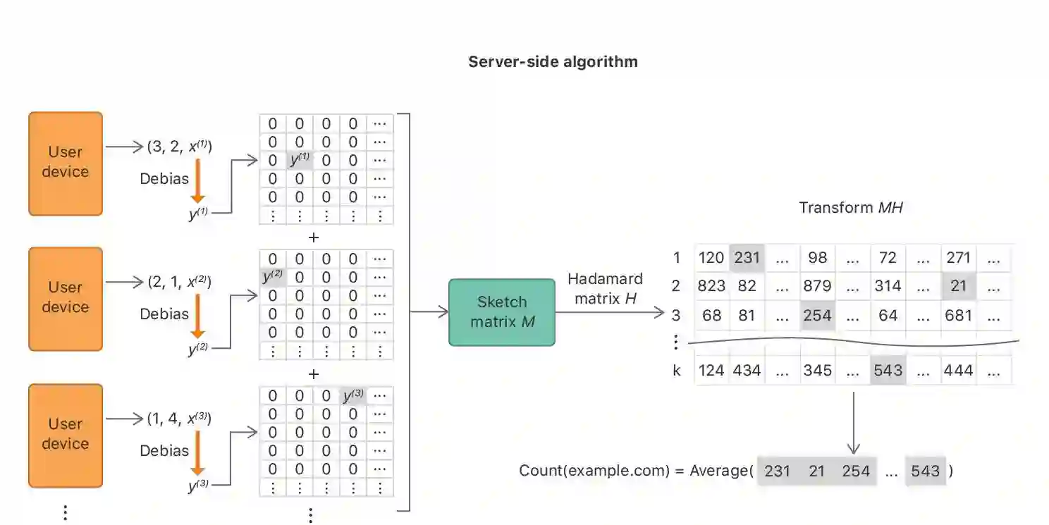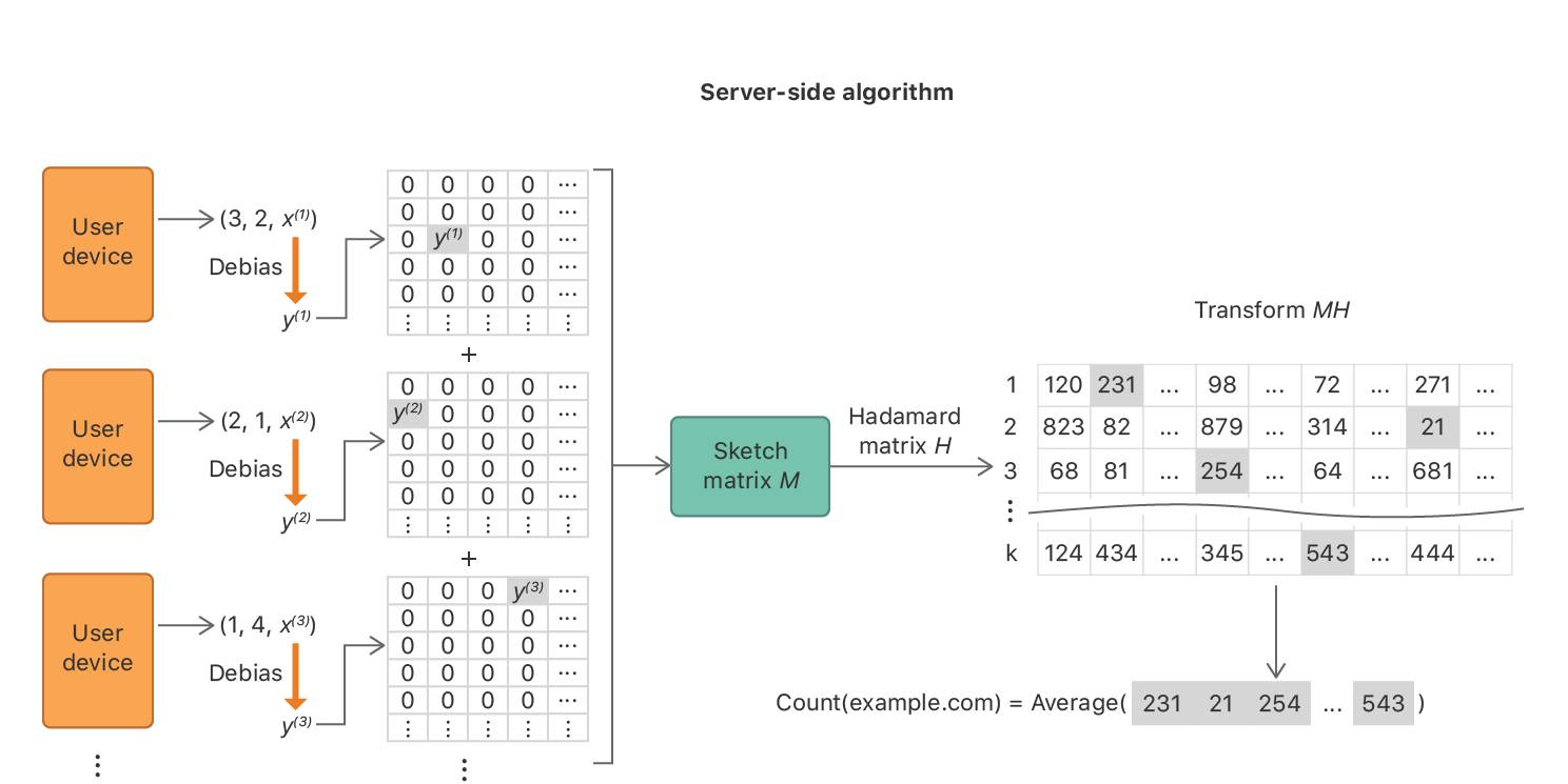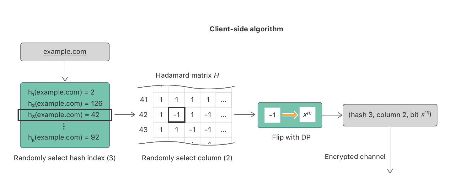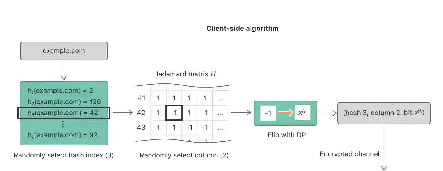举个例子吧,假设一名用户访问了 www.example.com 这个网站。客户端算法从一组散列函数(hash function){h1,h2,h3,…,hk}中随机抽取一个,假设抽到了h2,然后用它将上述网站域名以m的大小编码,即h2(www.example.com)=31。该编码被写成大小为m的one-hot向量,其中第31位被设置为1。为了确保隐私的差分性,one-hot向量的每一位独立地以概率翻转,其中ϵ是隐私参数,它构成了私有化的向量。这个向量和被选择的散列函数一起被输送至服务器。