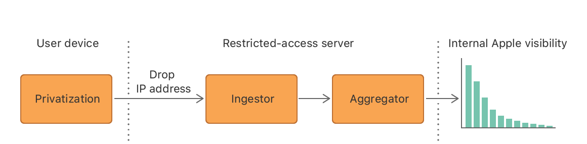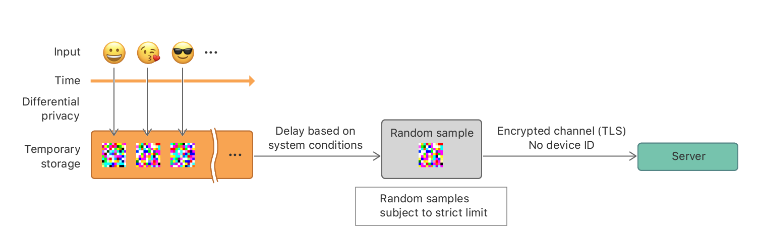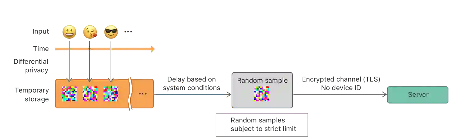 无论何时用户使用了设备,数据会立即通过有特殊参数ϵ的本地差分隐私进行加密,并使用数据保护(data protection)临时储存在设备上,而不是立即传输到服务器上。