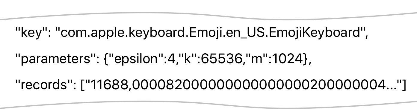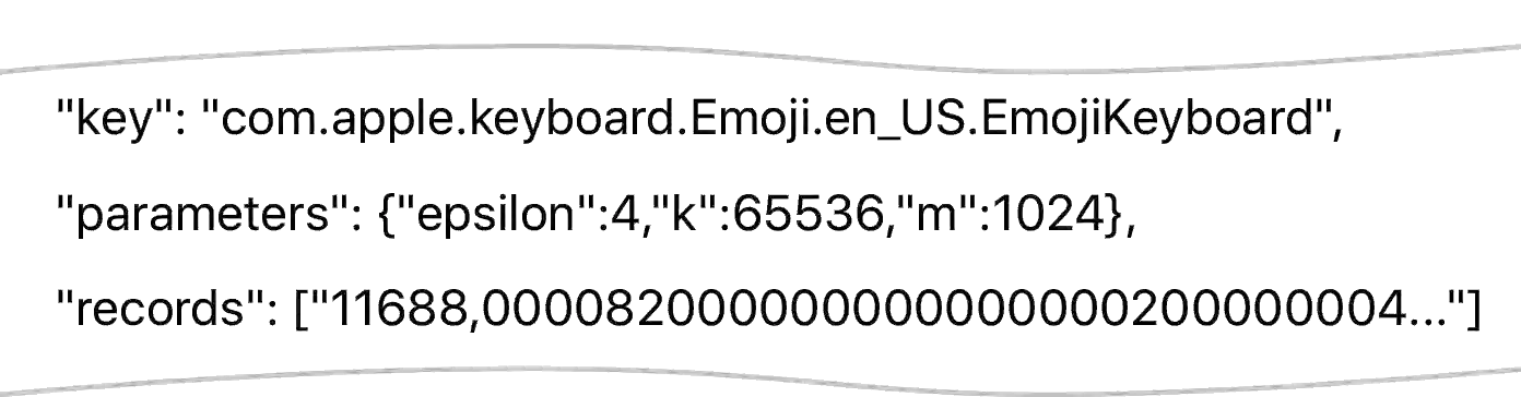 在iOS中打开“设置”>“隐私”>“分析”>“分析数据”后可看到“差分隐私”(DifferentialPrivacy)的入口。在macOS上,这些记录在“关于本机”的“系统报告”中可见。下图是算法对最受欢迎的emoji使用情况的样本记录,记录所涉及的算法和参数在下文会有体现。