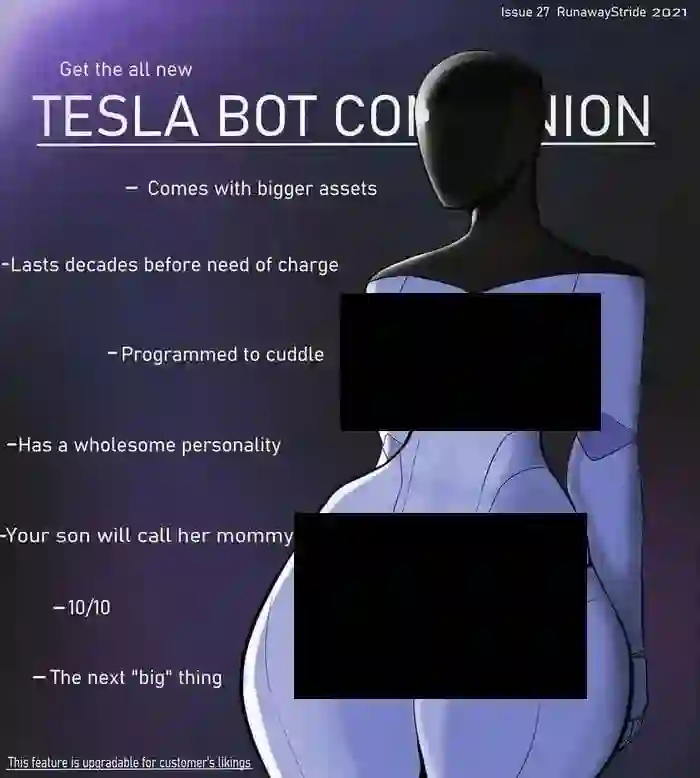 这是著名宅男福利图片网站9GAG上,网友畅想的「特斯拉家用机器人」理念图。功能很强大:「三围丰满;充电一次跑几十年;可编程抱抱;人格纯真;你儿子会管它叫妈。」
