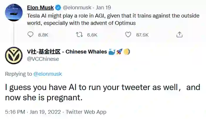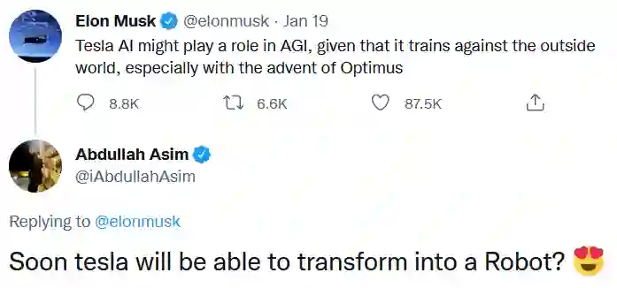 2022年1月19日,马斯克发推:「特斯拉AI可能将会在通用人工智能(AGI)中发挥作用,因为它可以针对外部世界进行训练,尤其是随着擎天柱机器人的出现。」