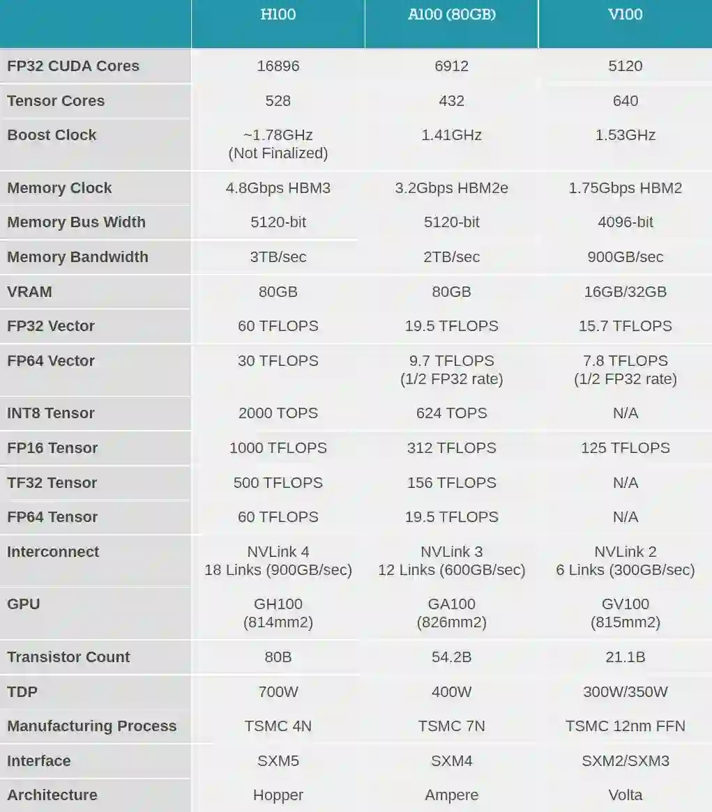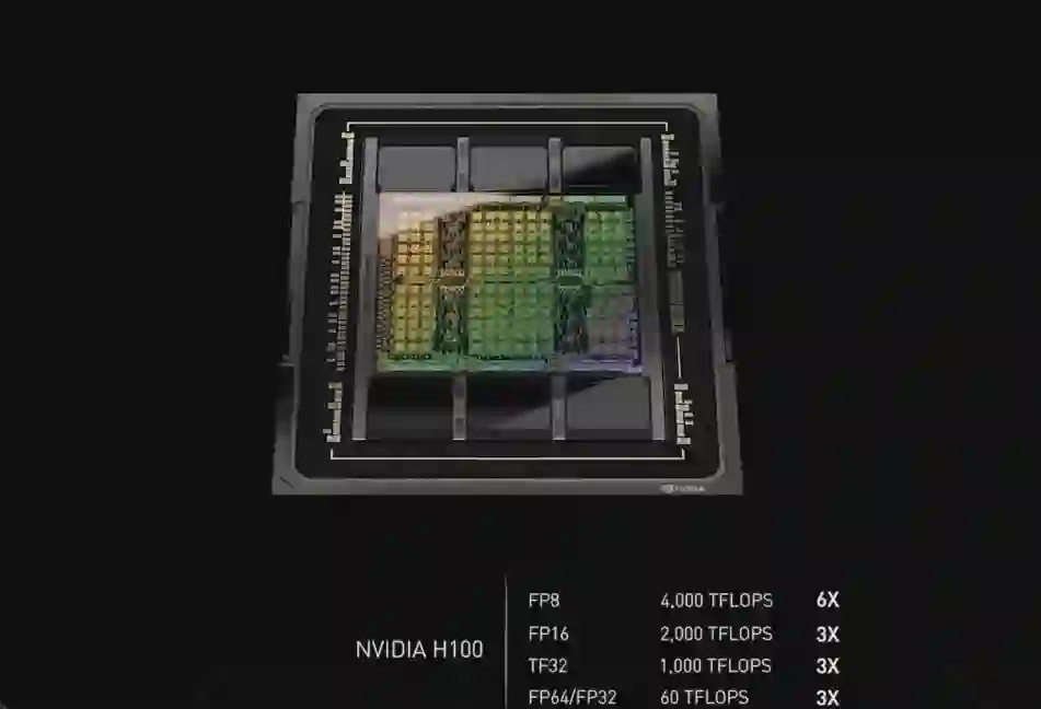 首先是性能的飞跃式提升,这是通过全新张量处理格式 FP8 实现的。H100 的 FP8 算力是 4PetaFLOPS,FP16 则为 2PetaFLOPS,TF32 算力为 1PetaFLOPS,FP64 和 FP32 算力为 60TeraFLOPS。