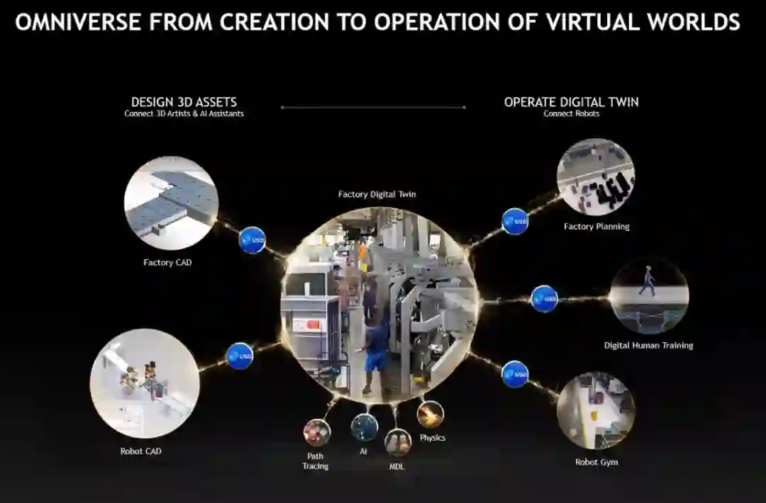 黄仁勋表示,英伟达的 Omniverse 涵盖了数字孪生、虚拟世界和互联网的下一次演进。下图为几种典型应用场景: