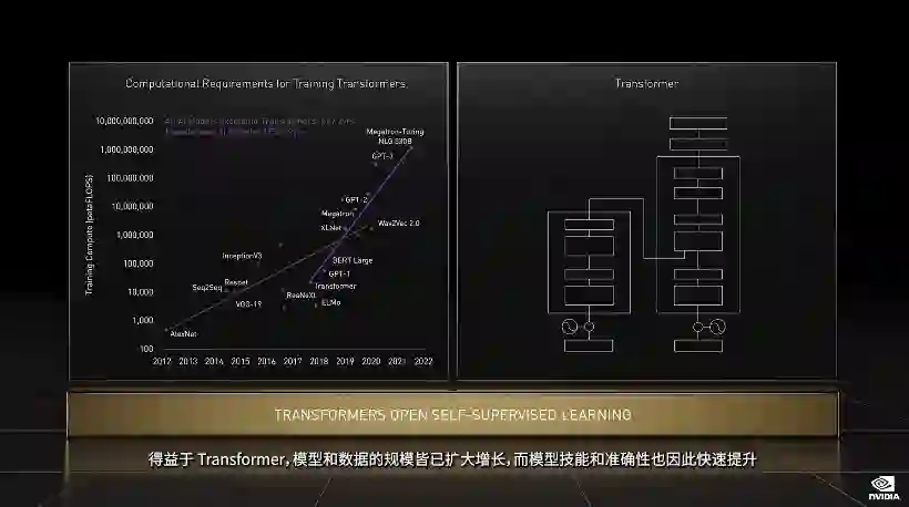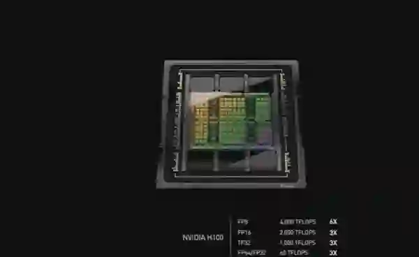 Transformer 类预训练模型是当前 AI 领域里最热门的方向,英伟达甚至以此为目标专门优化 H100 的设计,提出了 Transformer Engine,它集合了新的 Tensor Core、FP8 和 FP16 精度计算,以及 Transformer 神经网络动态处理能力,可以将此类机器学习模型的训练时间从几周缩短到几天。