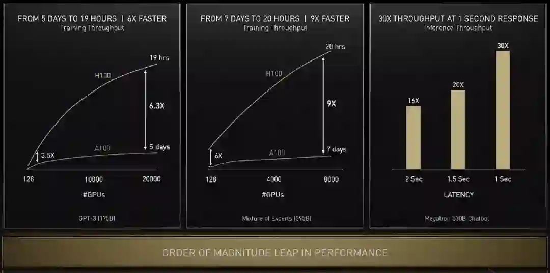 下面看看 H100 在具体任务上的性能提升:单看 GPU 算力的话训练 GPT-3 速度提升 6.3 倍,如果结合新的精度、芯片互联技术和软件,提升增至 9 倍。在大模型的推理工作上,H100 的吞吐量是 A100 的 30 倍。