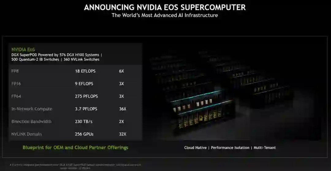 总而言之,EoS 将会是世界上最快的 AI 超级计算机,英伟达表示它将会在几个月之后上线。