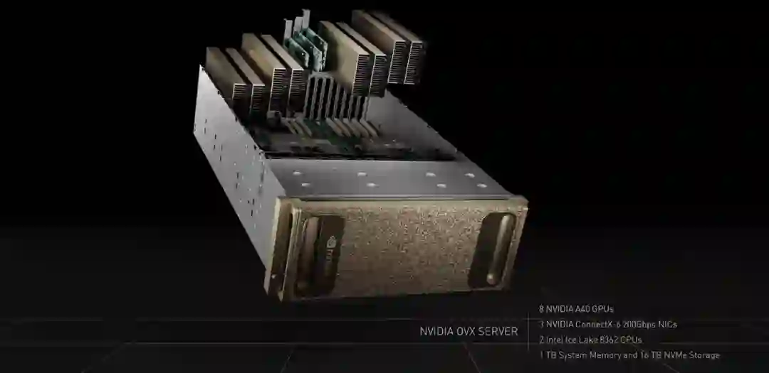 第一代 NVIDIA OVX Omniverse 计算机由 8 个 NVIDIA A40 GPU、3 个 NVIDIA ConnectX-6 200 Gbps 网卡、2 个 Intel Ice Lake 8362 CPU 以及 1TB 系统内存和 16TB NVMe 存储组成。