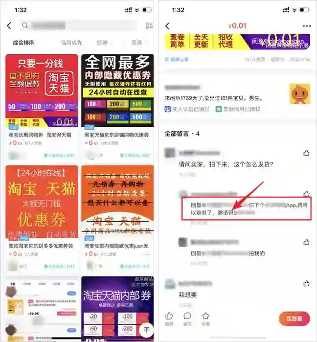 表面上看好像捡了个大便宜,1 分钱买到了全网优惠券,但实际上等你拍下后,卖家会让你下载一个 App,给你邀请码让你注册使用,相当于你花 1 分钱成了人家的下线。
