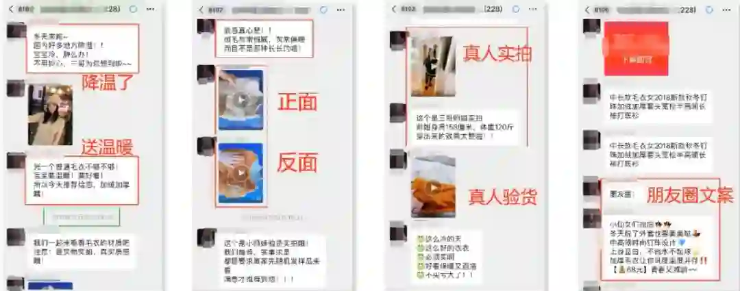 除了强调价格之外,他们还会发一些突出产品卖点的细节图片,比如加绒毛衣,拍细节围绕加绒展开写文案;再比如卖羽绒被时,把里面的绒展示给用户看,并引导已经购买的群友发验货小视频。