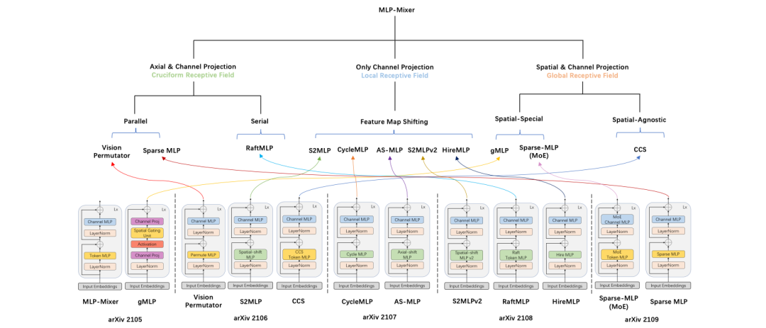 然后回顾了最近的一些模型模型的设计,描述了MLP、卷积和自我注意机制之间的区别和联系,并介绍了纯深层MLP体系结构面临的瓶颈和挑战。比较各种深度MLP变体的块设计,分析它们在设计实现、计算复杂性和感受野方面的异同。从内部到外部,从宏观角度分析了块体堆叠的发展,并将其分为单阶段、两阶段和金字塔类型。