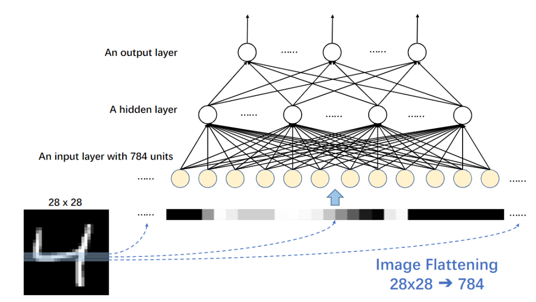 多层感知机最早是在MNIST上进行测试的一个分类器,将28×28的图像按行平展成一个一维矢量,这个矢量被视为初始节点然后经过一个全连接层。