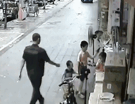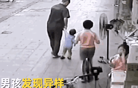 在一家店门口,三个小孩在玩耍。突然走过来一个男子,摸了摸那个最小的孩子,然后顺手就牵起了孩子的手,拖拽着往前走。幸好身边稍大一点的孩子把他拉了回来,否则这个人贩子就这样悄无声息的把孩子带走了!