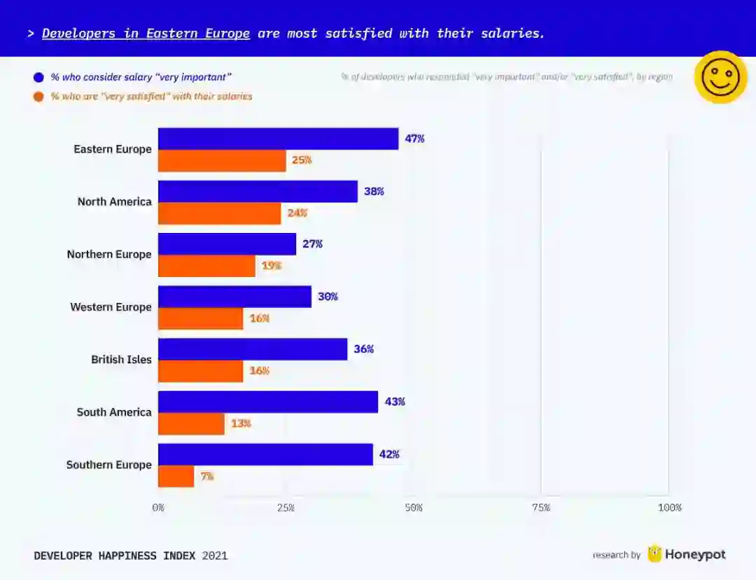 地理位置在确定薪酬满意度方面也发挥着作用。根据调查结果,东欧的开发人员对他们的薪水最满意,其次是北美。