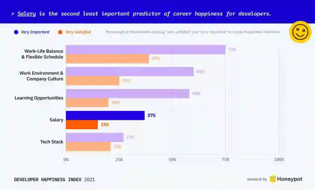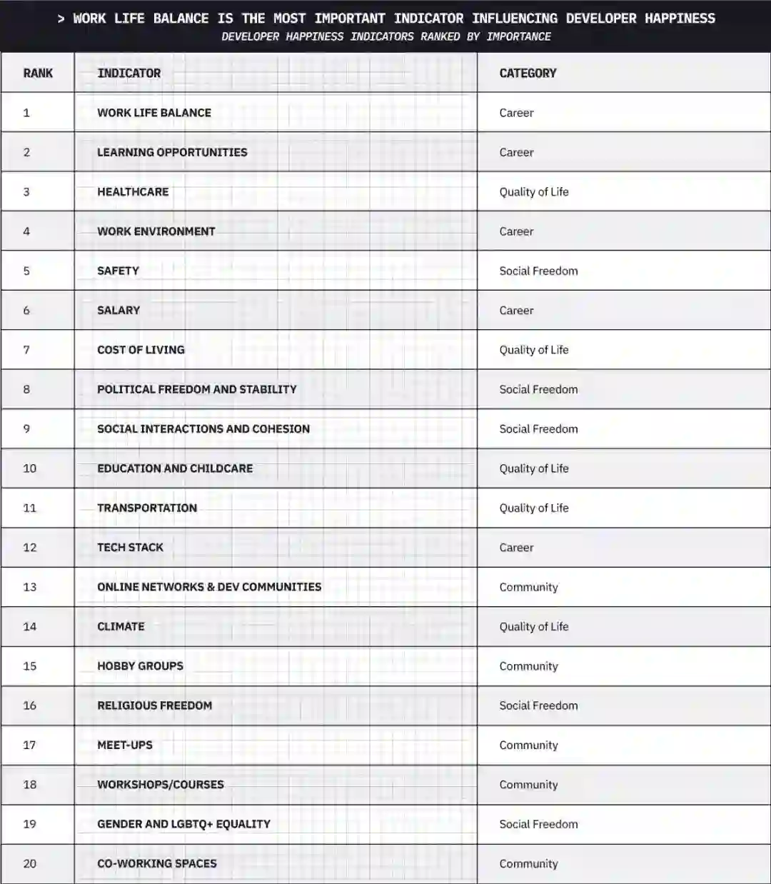 职业指标的重要性排名很高。幸福感排名前五的指标中的三个与开发人员的职业有关——工作与生活的平衡、学习机会和工作环境。