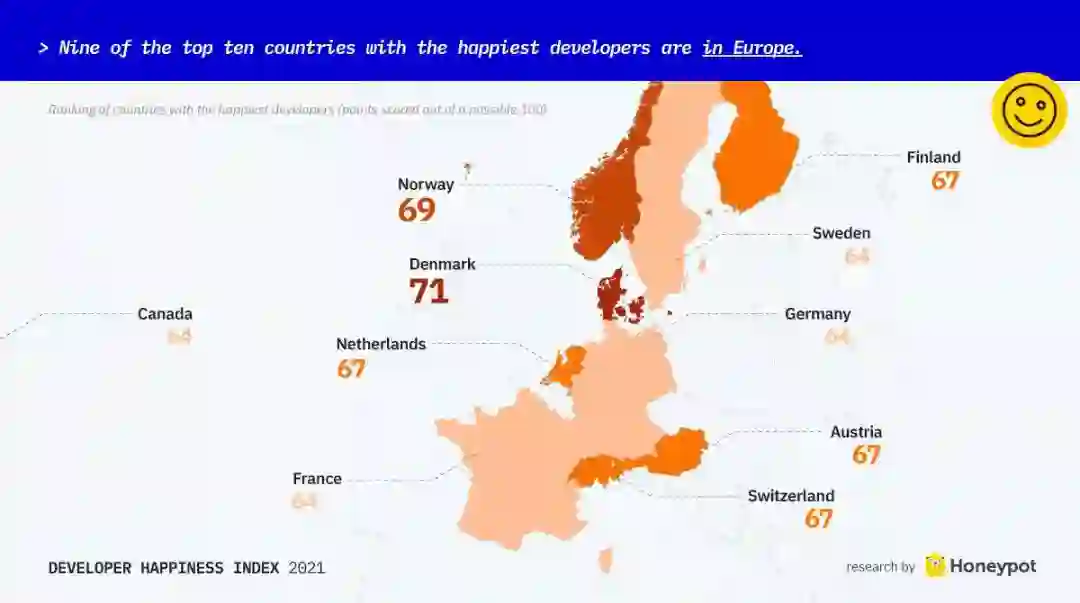 根据开发者所处位置的不同,他们在评估自己幸福度的方式上存在巨大差异。在全球范围内,北欧和西欧国家是让开发者最幸福的国家。