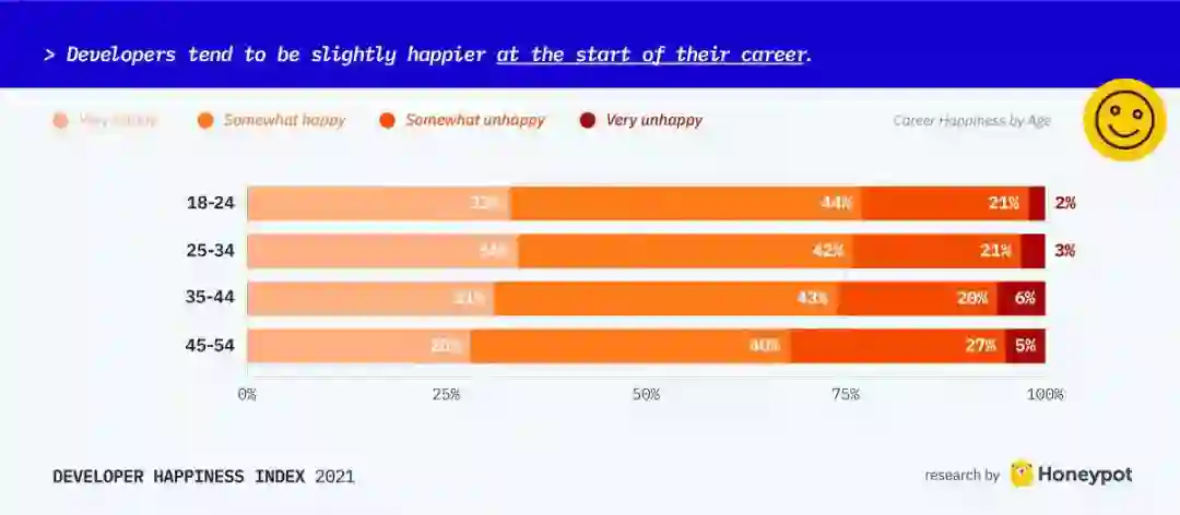 在各个细分条件中,无论是年龄、性别还是编码经验,开发人员的幸福感都保持着相当稳定。随着开发人员年龄的增长并获得更多的经验,他们会变得不那么快乐。