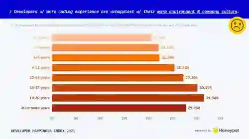 随着开发人员获得更多经验(20年以上的经验是唯一的例外),对工作环境和公司文化的满意度会降低。