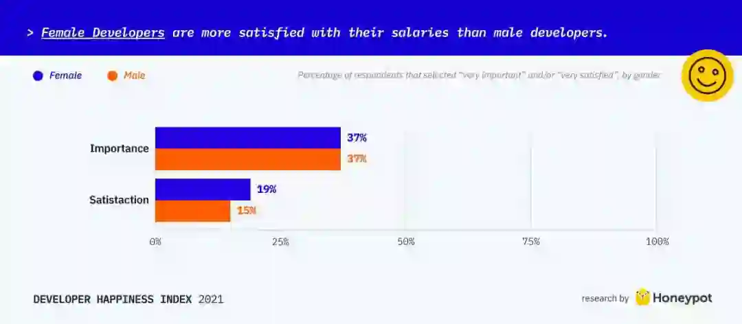虽然男性和女性都同等重视薪水,但女性开发者往往比男性开发者对他们的薪水更满意。2019年,InHerSight发现,总体而言,在科技行业工作女性报告的薪酬满意度是所有行业中最高的。