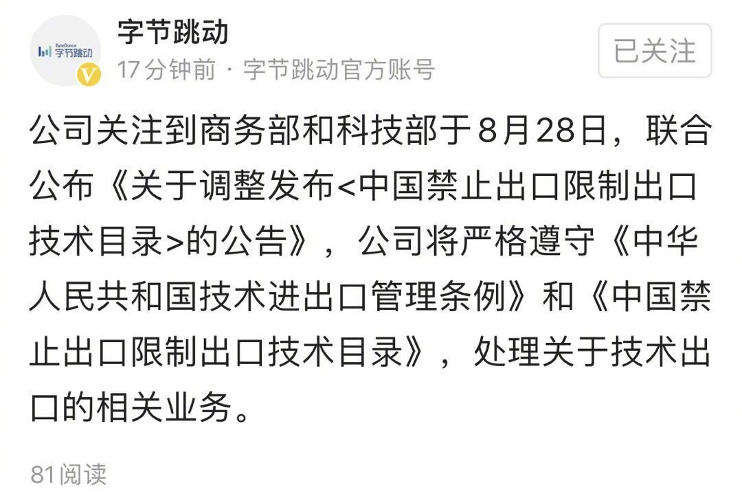 而近日我国调整《中国禁止出口限制出口技术目录》,是中国的法律。字节方回应「将严格遵守」。