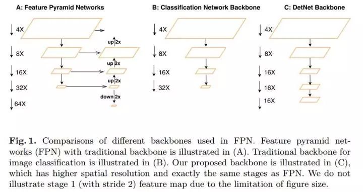 DetNet的整体网络结构和FPN的对比如下图所示: