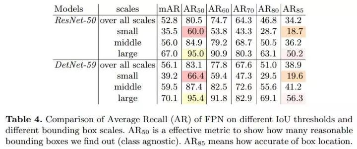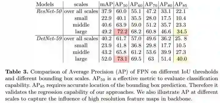 可以看到,DetNet在大物体的准确率上提升非常大,而且IoU指标越大效果越明显,这说明DetNet的深层网络还有很多分辨率细节信息,对最后准确定位帮助很多。另一方面,在IoU指标要求不大时,DetNet在小目标的召回率提升非常大,说明DetNet能很好地找到小物体,避免漏检。