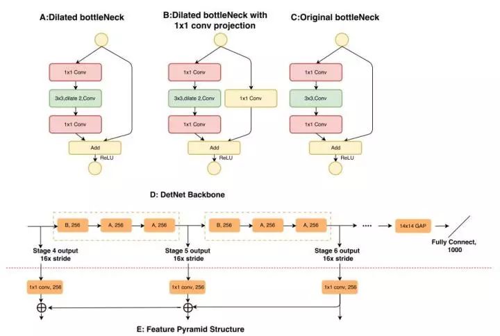 空洞卷积的计算需要花费大量时间,因此作者减少了stage 5和6的通道数,保持在256而不是会增加 这里其实比较值得关注的是B结构和A结构的区分。这里有一个比较关键的问题就是,在降采样因子固定以后,不同阶段是怎么区分的? 我们知道,ResNet在每个阶段的开始结构都是不同的,会对feature map降采样,这是区分不同阶段的关键。对比ResNet101和50的同一个阶段,我们会发现前者会叠加重复更多个上图中C的结构,但是它们仍然是属于同一阶段的……那么,DetNet又是怎么区分不同阶段并保证有实质性的效果提升而不是单纯累加结构? 答案就是B里面的1x1 Conv结构,我认为这种跨通道的信息融合还是能比较好地进行信息整合的。作者给出了实验证明,不再详细介绍。