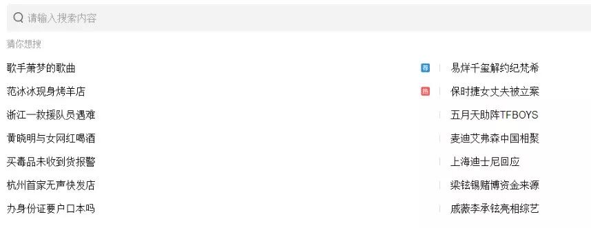 头条搜索的主界面非常简单,没有任何信息流、广告流,但点击搜索框之后,就会显示出“猜你想看”,其中包含当下的一些热点消息,比如《成绵高速路面“美颜”》《共青团批评薛之谦》《王俊凯睡袍造型》等,而且大部分是娱乐新闻。不过,时下的一些热点包括台风利奇马、《上海堡垒》等倒是没有在推荐之列。