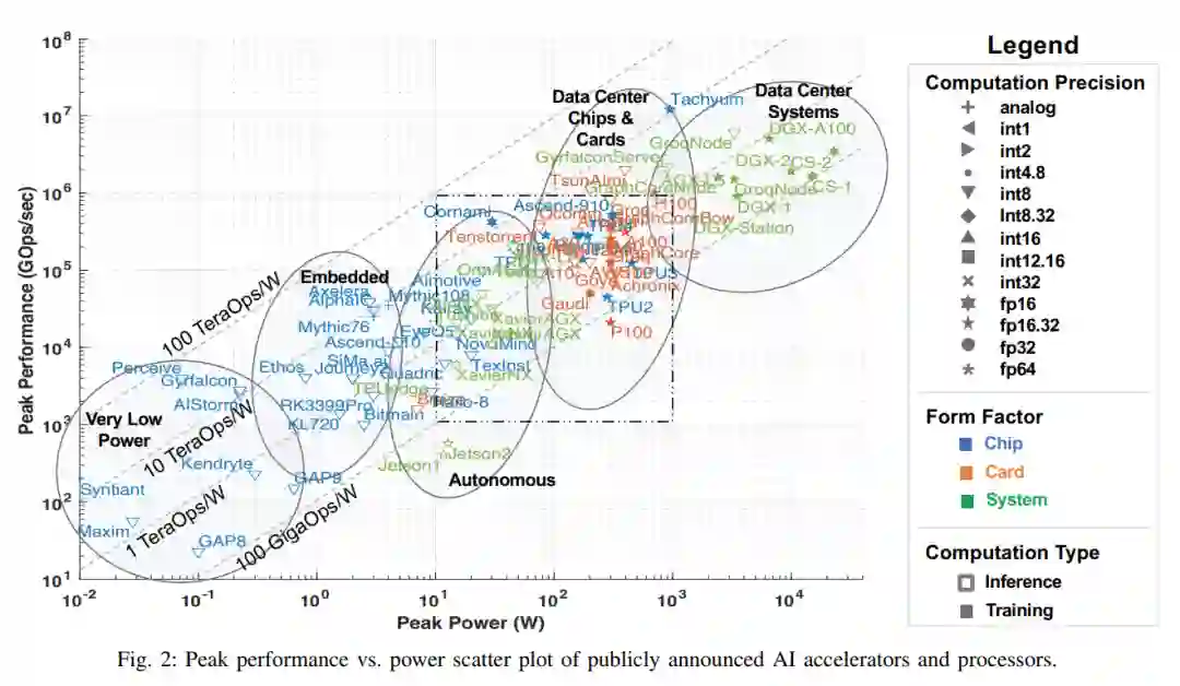 今年的论文中包含了两个基于加速器发布日期的新趋势图,以及一些神经形态的、光子的和基于忆阻的推断加速器的附加趋势。