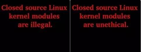 Linux 在代码上没有完全禁止闭源的驱动,这个曾被 LKM 的讨论者揪住不放。是出自 /usr/src/linux/include/linux/module.h 的头文件定义,/* * The following license idents are currently accepted as indicating free * software modules * * "GPL" [GNU Public License v2 or later] * "GPL v2" [GNU Public License v2] * "GPL and additional rights" [GNU Public License v2 rights and more] * "Dual BSD/GPL" [GNU Public License v2 * or BSD license choice] * "Dual MPL/GPL" [GNU Public License v2 * or Mozilla license choice] * * The following other idents are available * * "Proprietary" [Non free products]在这个问题上,Linux 内核的作者认为存在 LKM 可以不遵循 GPL 的灰色区域,他举的灰色区域的例子是说,比如说,某些 Linux 模块原本针对 Unix 系统进行开发,由于接口接近,被移植到 Linux 上,那么他认为这个模块不是 GPL 的。(one gray area in particular is something like a driver that was originally written for another operating system (i.e. clearly not a derived work of Linux in origin). [...] THAT is a gray area, and _that_ is the area where I personally believe that some modules may be considered to not be derived works simply because they weren't designed for Linux and don't depend on any special Linux behaviour.)(摘录自维基百科,Linux kernel 的 Loadable kernel modules and firmware 章节。)