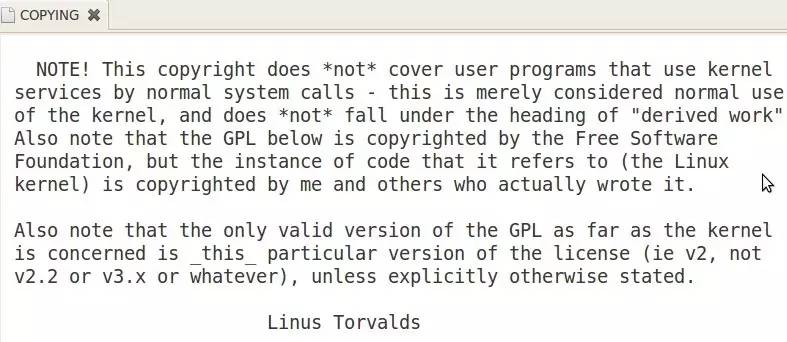 重新回到这三个问题,第一个问题,曾经被 Linux 内核的作者 Linus Torvalds 以及内核开发人员多次澄清普通系统调用为非 GPL 的作用范围,甚至固化在 Linux 内核的源码 COPYING 文档中,为 Linux 用户空间的程序采用非 GPL 的授权许可证打下了基础。