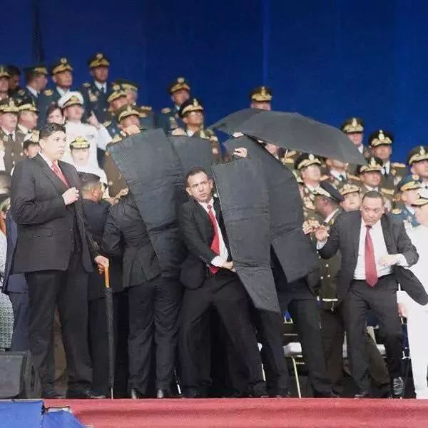 保镖们在爆炸发生后竖起盾牌保护总统马杜罗