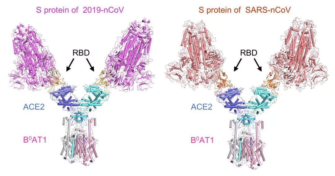 RBD-ACE2-B0AT1 复合物与冠状病毒S蛋白的结构比较,二者通过RBD结构域锚定在一起(左,新型冠状病毒2019-nCoV;右,SARS-CoV)