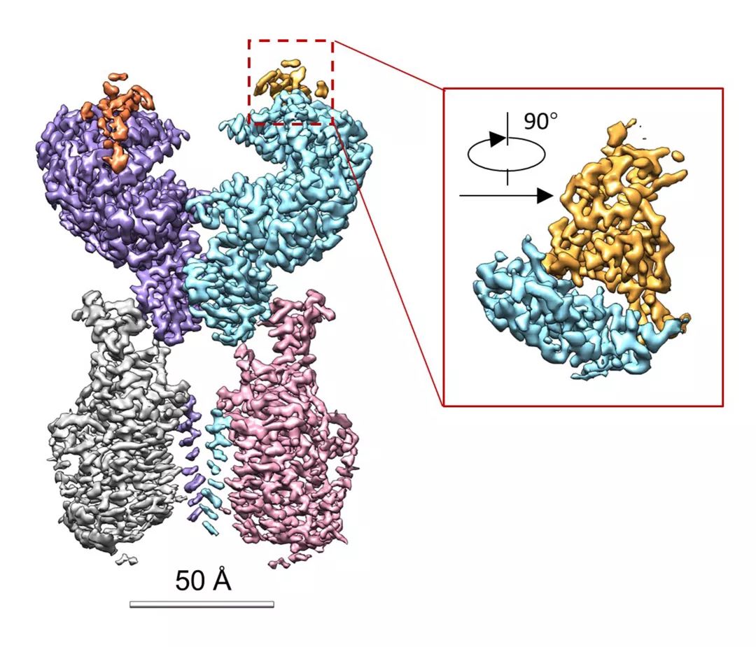 RBD-ACE2-B0AT1复合物的冷冻电镜密度图,框内为RBD与ACE2的相互作用界面