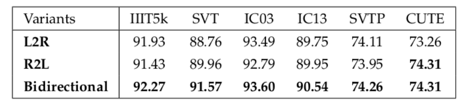 为了评估双向解码器的有效性,提出了三种模型变体,即L2R, 从左到右的顺序识别; R2L,从右到左的顺序;双向文本识别。这些变体也使用4.1节中描述的相同训练设置从零开始进行训练。表5比较了它们的识别精度。